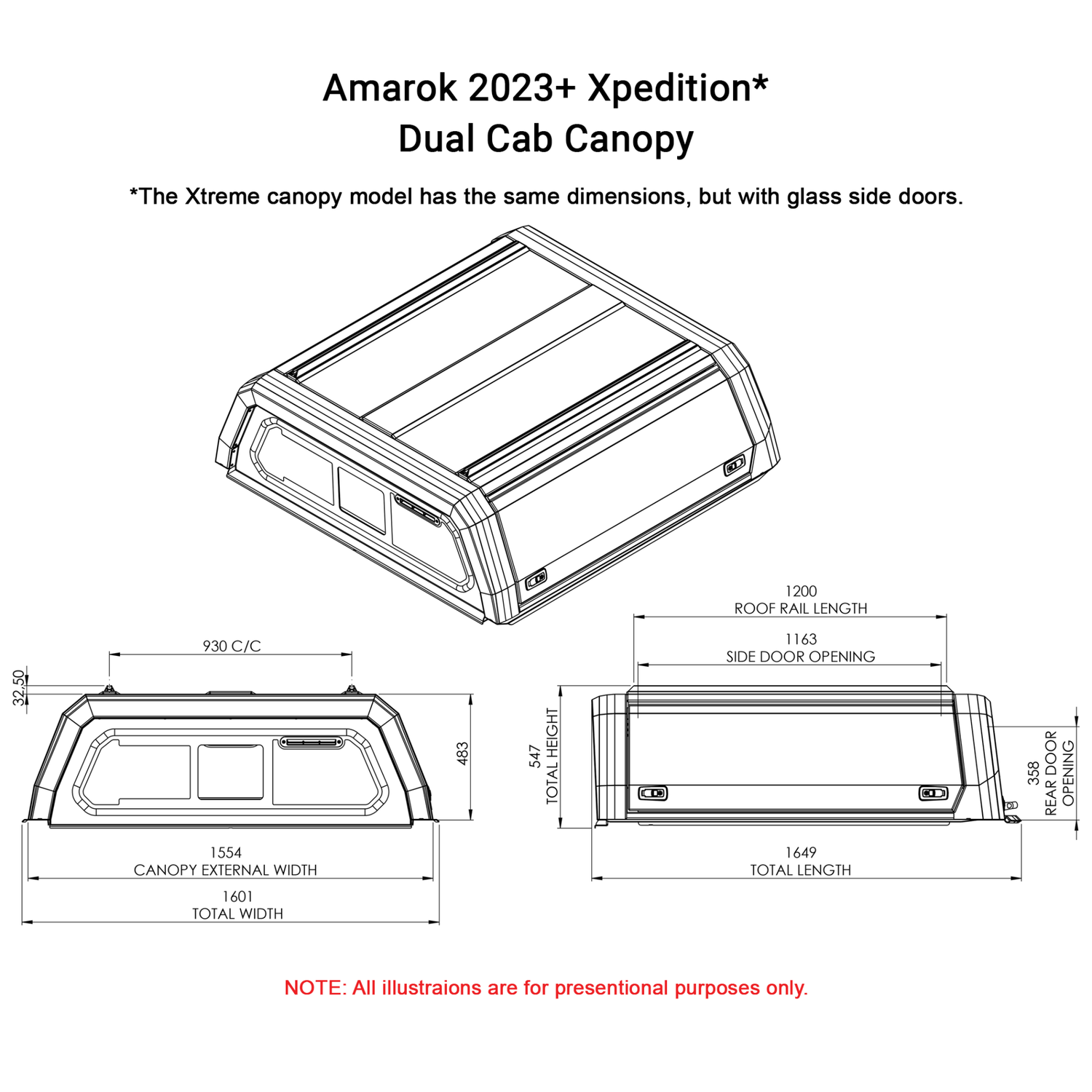 This canopy is custom-built for the 2023+ Amarok Double Cab, ensuring seamless alignment with body lines, tailgate, and factory mounting points. Features include solid aluminium gullwing side doors with gas struts, a bonded rear glass panel with integrated brake light, and a front sliding glass window with airflow vent for circulation. Automotive-grade rubber seals and keyed-alike locks provide secure, dust- and water-resistant storage.