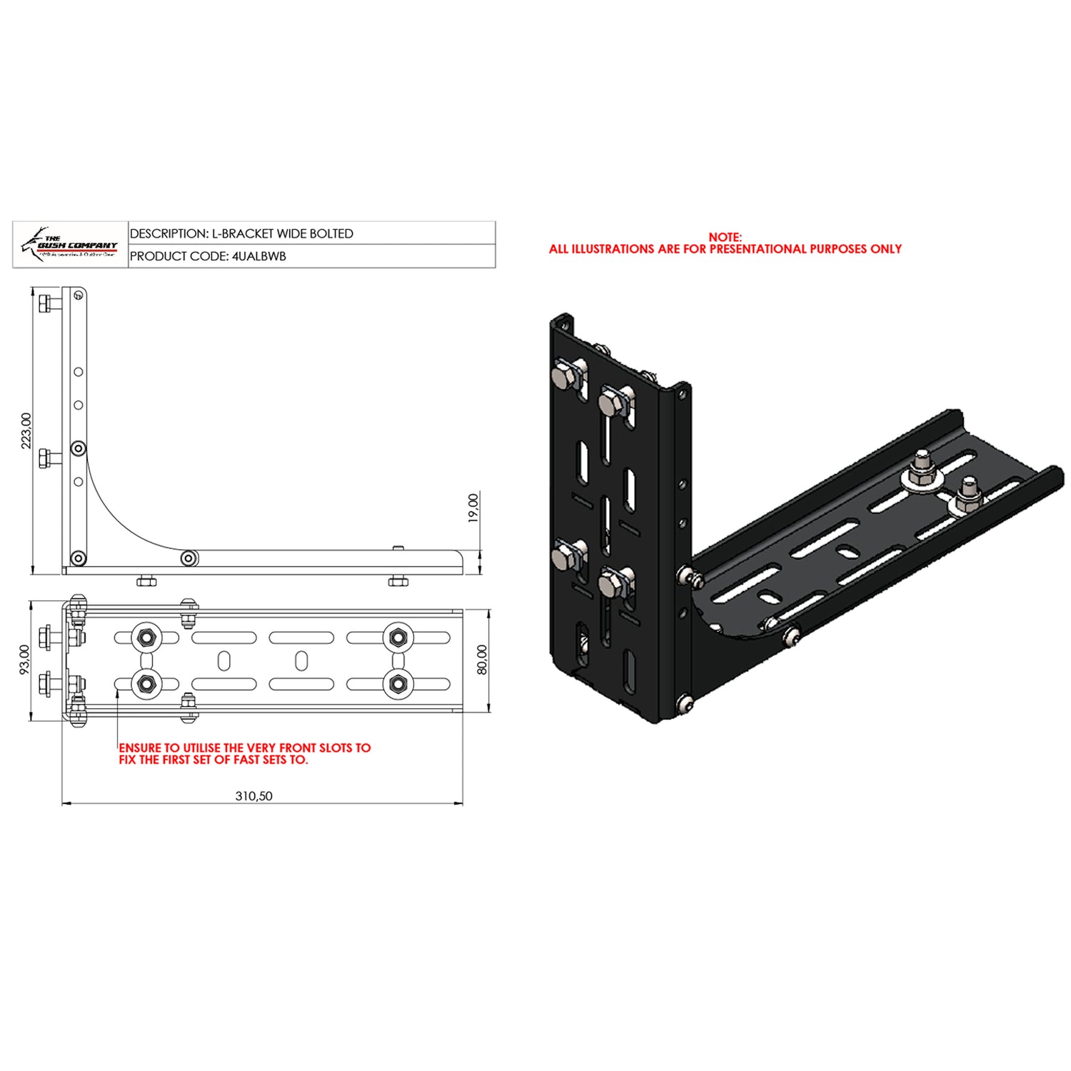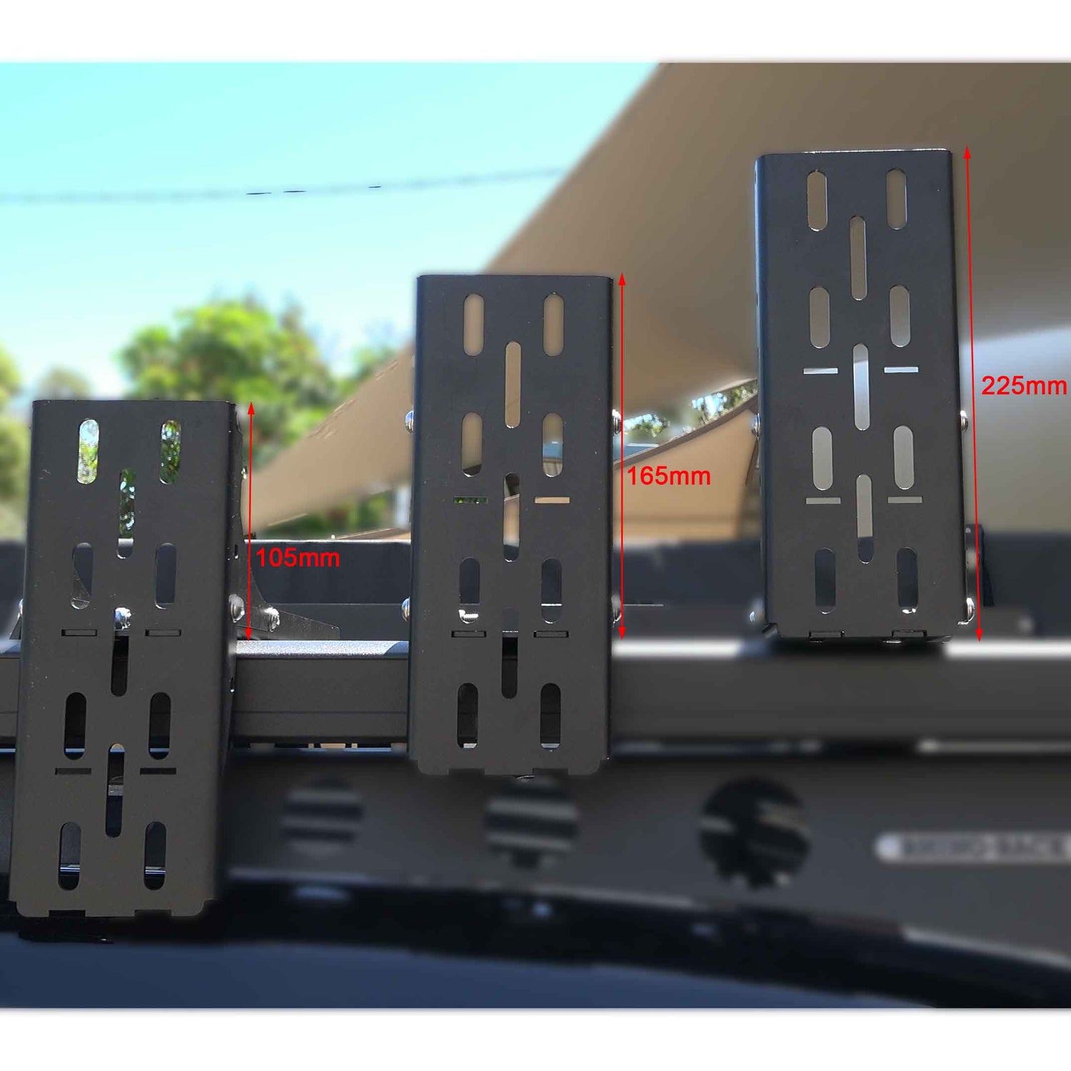 Supplied with three heavy-duty adjustable L-brackets, the awning mounts easily to most roof racks or load bars. A minimum of 1.9m spacing between mounts is required for secure installation. The 2.3m packed length fits standard roof profiles without overhang, while optional brackets support direct integration with Bush Company rooftop tents for a streamlined overlanding setup.